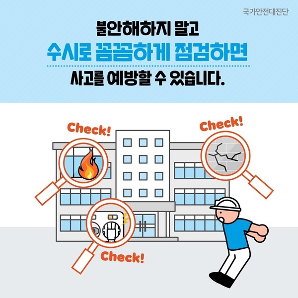행정안전부 등 관계부처는 6월 10일부터 7월 10일까지 한 달간 국가안전대진단이 실시된다고 밝혔다. 국가안전대진단은 ▲중앙부처 ▲지방자치단체 ▲공공기관 ▲시설관리주체 그리고 국민들이 함께 참여해 건축물과 시설물 등 사회전반에 대해 안전관리실태를 집중 점검하고 생활 속 안전 위험요소를 진단하는 예방활동이다.