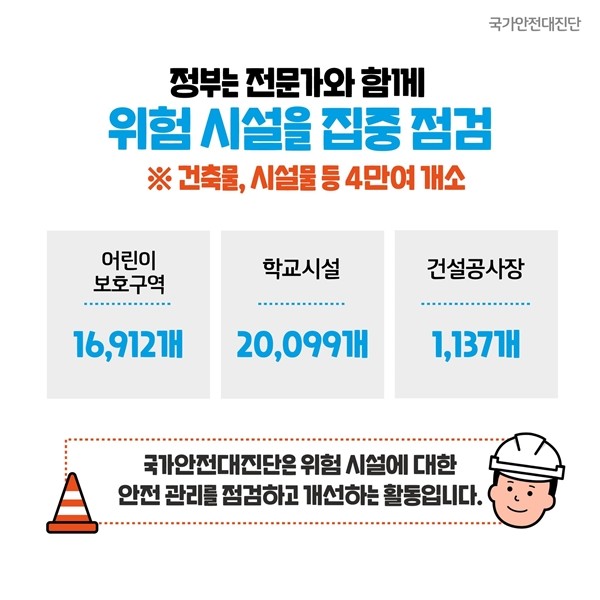 올해 국가안전대진단에는 행정안전부, 국토교통부, 환경부 등 27개 중앙부처와 공공기관 등이 참여한다. 코로나19가 지속되는 상황을 고려, 어린이보호구역‧학교시설 등 국민인식조사와 빅데이터 분석을 통해 파악한 국민관심 분야와 건설공사장‧여름철 산사태 취약지역 등 위험시설 4만8,000여 개소를 대상으로 점검을 실시한다. 건설공사장 점검대상은 모두 1,137개소이다.