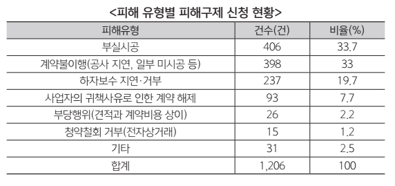 소비자원이 리모델링 관련 피해구제 신청 1,206건을 피해유형으로 분류한 결과 실측오류·누수·누전·결로·자재훼손 등 ‘부실시공’ 관련 피해가 406건(33.7%)으로 가장 많은 것으로 나타났다. 이어 공사 지연과 일부 미시공 등 ‘계약불이행’ 관련 피해가 398건, 하자보수 지연과 거부가 237건, 사업자의 귀책사유로 인한 계약해제 등이 뒤를 이었다.