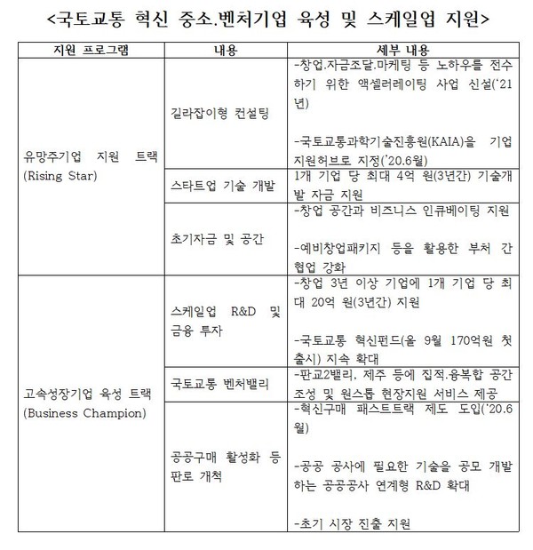 국토부는 국토교통 10대 중점 육성 분야를 선정하고, 관련 스타트업 1000개의 창업을 지원하는 ‘Rising Star 프로그램’과 250개 중소‧벤처기업의 성장을 이끄는 ‘Business Champion 프로그램’을 운영한다.