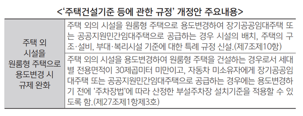 정부가 5·6 대책의 후속조치로 지난 7월에 입법예고한 개정안은 오피스·상가·숙박시설을 장기공공임대주택으로 전환하는 경우에만 주택건설기준 적용 특례와 주차장 증설을 면제했다. 그러나 8·4 대책에서 규제 완화 대상을 민간사업자의 공공지원민간임대주택까지 확대함에 따라, 민간사업자가 공급하는 공공임대주택도 장기공공임대주택과 동일하게 주택건설기준 적용을 완화하고 주차장 증설을 면제하기로 했다. 다만, 주차장 증설 면제 시에는 주차문제 발생을 방지하기 위해 공공지원민간임대주택의 임차인 자격을 차량 미소유자로 제한한다.