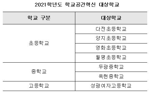 울산광역시교육청(이하 울산교육청)은 학생배움중심 미래형 학교공간 구성을 위한 2021학년도 학교공간혁신 대상학교 9개교를 선정했다고 발표했다.
