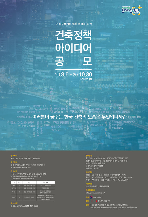 국토교통부 주최, 건축도시공간연구소(auri)가 주관하는 공모전은 국민들이 필요하다고 생각하는 건축정책을 직접 제안받고, 우리나라 건축의 현재 진단 및 미래 건축 비전 제시 등 건축과 공간 환경에 대한 국민들의 인식과 생각을 공유하기 위한 것이다.