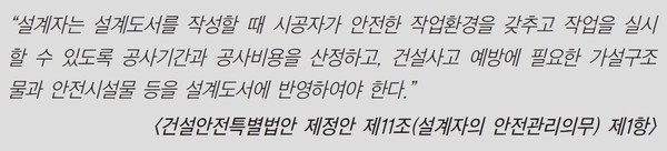 ‘발주자 책임 떠넘기기’라는 비판도 나온다. 제정안은 “정정순 의원이 지난 9월 1일 대표발의한 ‘건설기술진흥법 개정안’의 의결을 전제로 한다”고 밝히고 있다. 건진법 개정안은 ‘발주자의 적정 공기 산정 의무화’ 도입을 뼈대로 하는데, 사업 각 주체들의 책임을 규정한 건설안전특별법에서는 이러한 발주자의 공사기간 산정 의무를 엉뚱하게 설계자에게 부과하고 있어서다. 건설현장에서 발생하는 사망사고의 상당부분이 공사기간을 단축하려고 무리하게 진행한 작업에서 발생하는 상황에서 설계자에게만 과도한 책임을 묻는 셈이다.