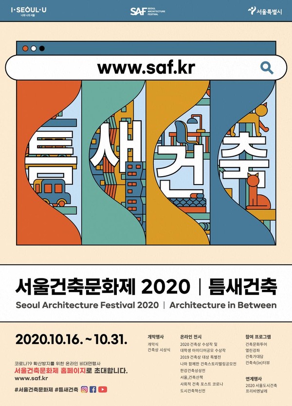 올해 서울건축문화제는 온라인을 통해 진행된다. 코로나19 확산을 방지하기 위해서다. 14일 서울시는 ‘서울건축문화제 2020’을 10월 16일 개막식을 시작으로 31일까지 서울건축문화제 홈페이지(www.saf.kr)를 중심으로 진행한다고 밝혔다.
