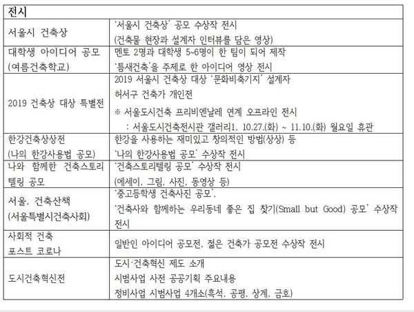 온라인 시민참여 프로그램으로는 열린 강좌, 건축가대담, 건축속(in)터뷰 등이 마련됐다. 오프라인으로 진행되는 건축문화투어는 온라인에서 코스별 안내영상으로 볼 수 있다.