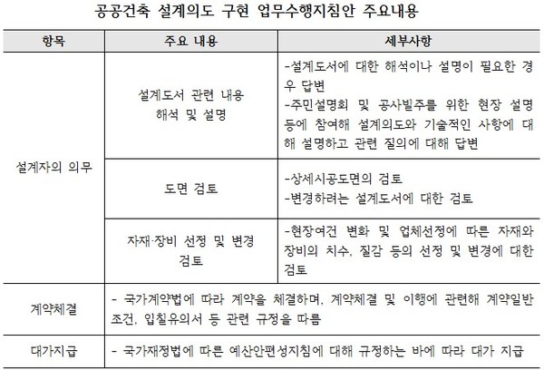 행정예고된 업무수행지침안의 주된 내용으로는 ▲설계자의 의무 ▲계약체결 ▲대가지급에 관한 내용이 포함됐다.