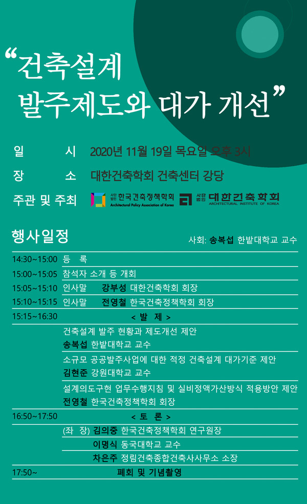 (사)한국건축정책학회·(사)대한건축학회가 공동 주관하는 세미나는 ‘건축설계 발주제도와 대가 개선’을 주제로 오는 11월 19일 오후 3시부터 6시까지 대한건축학회 건축센터 강당에서 열린다.