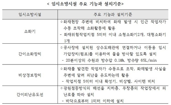 소방청 최병일 소방정책국장은 “소방시설이 없는 공사장에서도 큰 화재가 날 수 있는 만큼 임시소방시설을 설치하는 것은 큰 사고를 미연에 방지하는 필수시설”이라고 강조하며, “올해 안에 임시소방시설 설치기준 등을 보완하는 내용의 건설현장의 화재 안전 기준을 제정해 내년부터 시행하겠다”고 밝혔다.