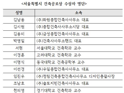 한편, 처음으로 도입한 ‘서울특별시 건축공로상’은 서울시 건축문화 활성화와 저변확대를 위해 다양한 분야의 건축활동과 성공적 시책 추진을 애쓴 공로가 있는 건축사 등 11명이 선정됐다.