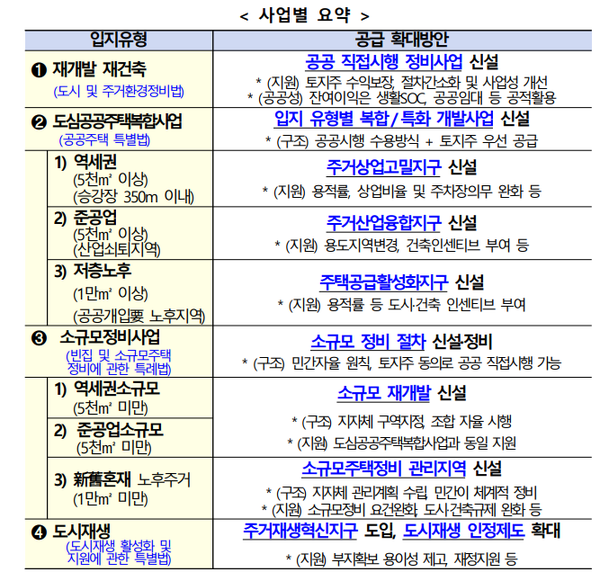 역세권, 준공업지역 중 5000㎡ 미만인 소규모 입지에 대해서는 기존 소규모 정비사업을 개선한 ‘소규모 재개발사업’을 신설, 주택공급을 활성화하고 낙후된 환경도 개선한다.