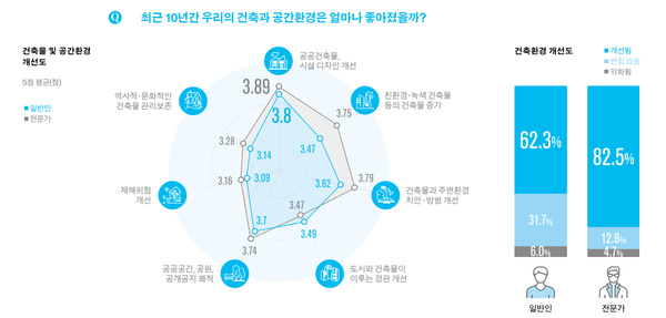 최근 10년간 건축 및 공간환경 변화 여부에 대해 일반 국민의 62.3%, 전문가의 82.5%가 개선됐다고 응답했다. 일반인이 전문가보다 긍정적으로 응답하는 비율은 낮았지만 긍정적으로 응답하지 않은 이들 중 부정 의견보다 중립 의견이 많았다.