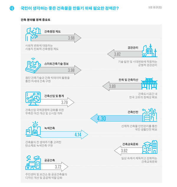 좋은 건축을 위해 필요한 정책을 묻는 질문에는 첫 질문에서 정책 체감도가 낮았던 항목들이 반대로 높게 나타났다. 개선이 가장 덜 됐다고 대답했던 ‘건축안전’이 5점 척도 중 4.3점으로 가장 높았으며 다음으로 ‘녹색건축(4.14점)’, ‘건축행정제도(3.98점)’, ‘한옥 및 건축자산(3.89)’ 순으로 응답자가 많았다.