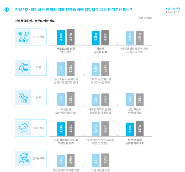 현재와 미래의 건축정책에 영향을 미치는 메가트렌드로 전문가들은 ‘인구사회’와 ‘기후환경'을 꼽았다.