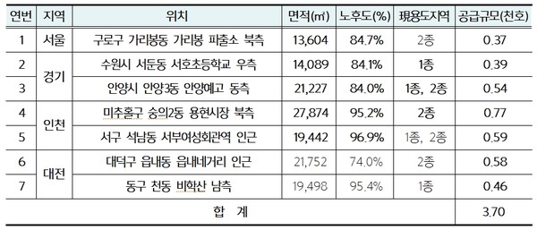 서울 구로구, 경기 수원시·안양시, 인천 미추홀구·서구, 대전 대덕구·동구 등 7곳은 공공주도로 신속한 계획 수립을 통해 쇠퇴한 도심을 빠른 속도로 재생할 수 있는 주거재생혁신지구 선도사업 후보지로 선정됐다. 최대 공급 가능 물량은 3,700가구다.