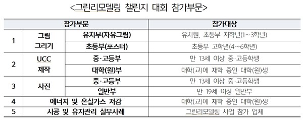 대한건축학회, 한국토지주택공사(LH). 국토안전관리원, 대한설비공학회, 한국 FM(퍼실리티 매니지먼트)학회 그리고 그린리모델링 지역거점 플랫폼 대표기관이 주관하며 그린리모델링과 관련한 ▲그림 그리기 ▲영상제작 ▲사진전 ▲에너지·온실가스 저감 분석 ▲시공 및 유지관리 실무사례 등 총 5개 부문으로 구성됐다.