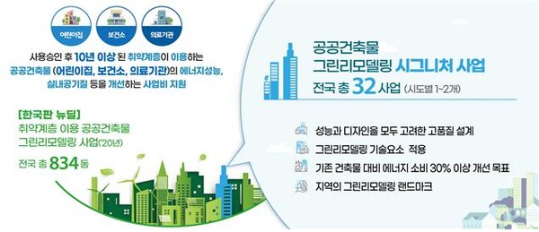 국토부는 지난해 7월 전국 195개 지자체 공공건축물 834동에 대한 그린리모델링을 착수했으며 각 시도별로 지역을 대표하는 건축물을 추천받아 총 32개 사업(시도별 1∼2개)을 시그니처 사업으로 선정했다. 시그니처 사업은 보다 적극적인 건물 에너지 절감·실내환경 개선 기술이 적용된다.