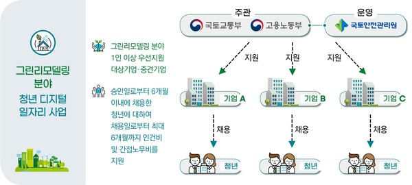 청년 디지털일자리 사업은 정보기술(IT)을 활용하는 직무에 미취업 청년을 채용한 기업에 인건비를 지원해 주는 사업으로, 국토부는 고용노동부와의 협업을 통해 그린리모델링 분야에서 사업을 추진한다고 밝혔다.