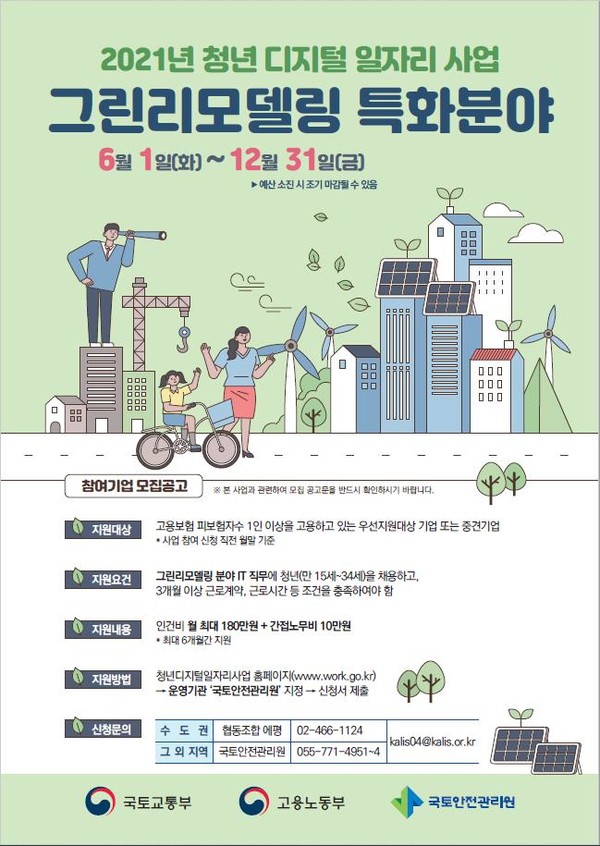국토교통부는 국토안전관리원(舊 한국시설안전공단)과 함께 그린리모델링 분야 ‘청년 디지털일자리 사업’에 참여할 기업을 모집한다고 5월 31일 밝혔다.