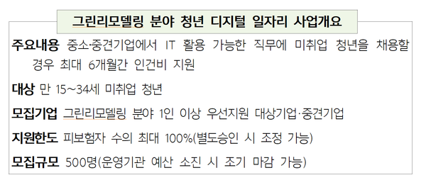 선정된 기업은 그린리모델링 분야 3D 모델링, 건물 에너지 시뮬레이션 분석, 기록물 디지털·전산화 등 IT 활용 직무에 청년(만 15∼34세)을 채용하고, 3개월 이상 근로계약(정규직 포함)·4대 보험 가입 등 조건을 충족할 경우 인건비를 지원받을 수 있다.