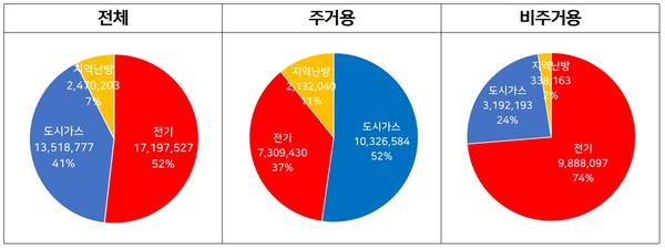 에너지원별로 보면 건물부문 에너지사용량은 전기가 전체의 52%로 절반 이상(52%)을 차지하고, 나머지는 도시가스(41%), 지역난방(7%) 순이었다. 한편, 주거용 에너지사용량은 도시가스(52%)가 가장 많은 비중을 차지하는 것으로 나타났으며, 비주거용의 경우에는 전기(74%)가 가장 많은 것으로 집계됐다.