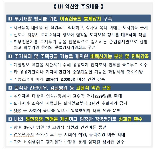 이번 혁신방안에는 투기가 재발하지 않도록 강력한 통제장치를 구축하고, 전관예우·갑질 등 고질적 병폐를 제도적으로 차단하는 것을 주요 골자로 한다. 또 독점적 권한을 회수하고, 비대화된 조직을 효율화하기 위해 기능과 인력을 축소하는 내용도 담고 있다.