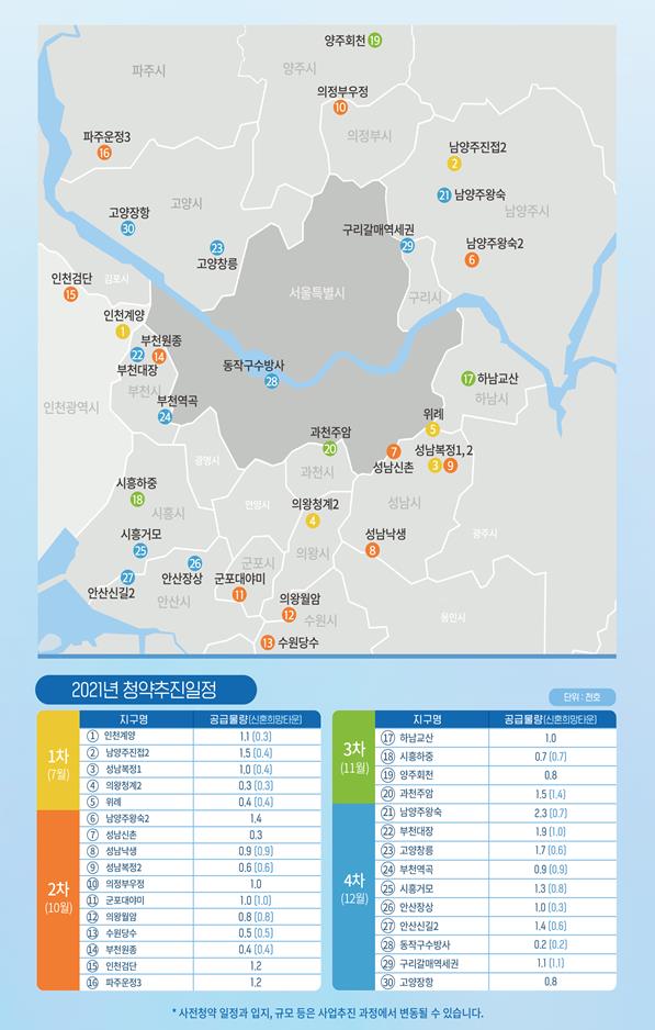 7월에는 3기 신도시인 인천계양(1,050가구), 위례신도시(418가구), 성남복정1(1,026가구), 의왕청계2(304가구), 남양주진접2(1,535가구)에서 총 4,333가구가 공급된다.