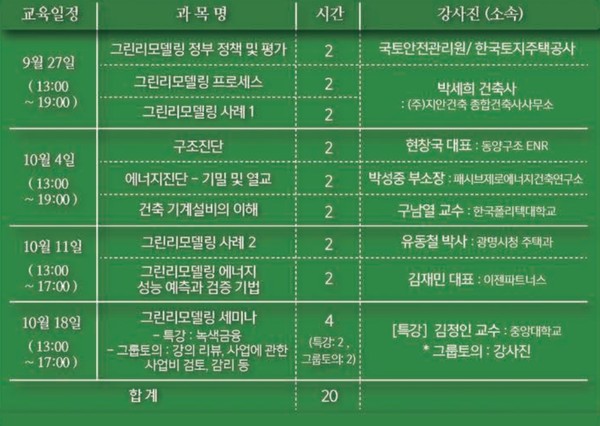 대한건축사협회가 함께 하는 ‘그린리모델링 수도권 거점 플랫폼 중앙대학교센터’에서는 9월 27일부터 10월 18일 4주간 매주 월요일 오후마다 ‘그린리모델링 전문가 양성 무상교육’을 진행한다.