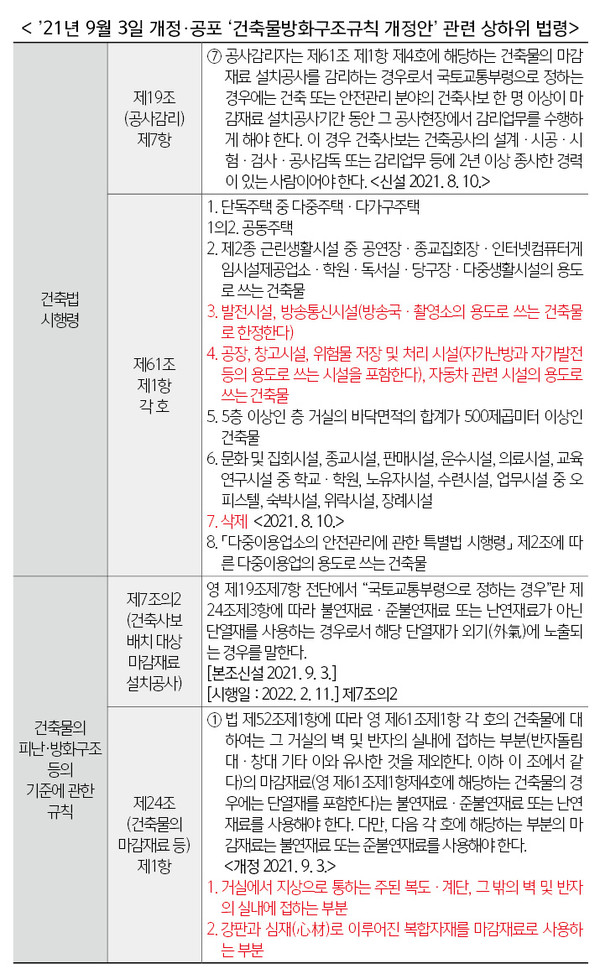 국토교통부는 9월 3일 이 같은 내용의 ‘건축물의 피난·방화구조 등의 기준에 관한 규칙 개정안’을 공포하고 이 규칙이 2022년 2월 11일부터 시행된다고 밝혔다. 건축물의 마감재료에 관한 사항은 이 규칙 시행 이후 건축허가, 건축신고, 용도변경 허가의 신청 때부터 적용된다.
