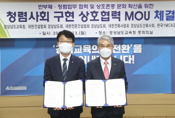 협약은 경남교육청의 반부패·청렴정책 추진을 계기로 우월적 지위를 이용한 갑질행위 근절, 정당한 대가지급을 통한 적정 업무 실시 등 건축·건설관련 업무 수행 시 나타날 수 있는 반부패, 부당행위를 근절하고자 추진됐다.