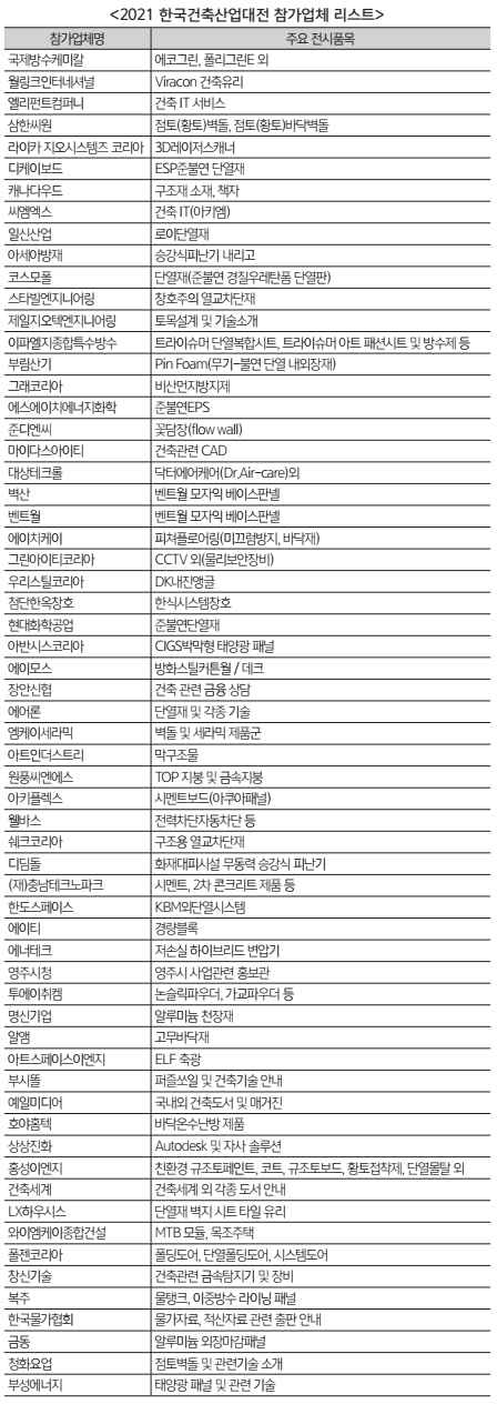 한국건축산업대전 집행위원회 관계자는 “건축문화산업의 발전을 도모하고 건축인들간의 정보교류와 비즈니스의 마당을 조성해 즐길 수 있는 전시회가 될 것”이라면서 “아울러 코로나19 확산 방지를 위한 정부의 방역지침에 따라 입장 시 발열체크, 자가문진표 작성 등 방역관리에도 협조를 부탁한다”고 밝혔다.