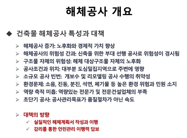 현재 국내 해체공사 제도의 한계로는 ▲건축물 해체공사 관련 안전관리기준이 여러 제도로 분산돼 있으며 ▲제도별 해체공사 안전관리 건축물의 대상이 서로 다르고 ▲재해 사례가 많은 중소규모 건축물의 경우, ▲신고만으로 해체공사가 가능 ▲해체공사계획서에 대한 관리 및 전문가 검토 절차 부재 ▲해체공사 사전조사에 필수적인 기존 건축물에 대한 정보 보관체계 미흡 등이 지적됐다.