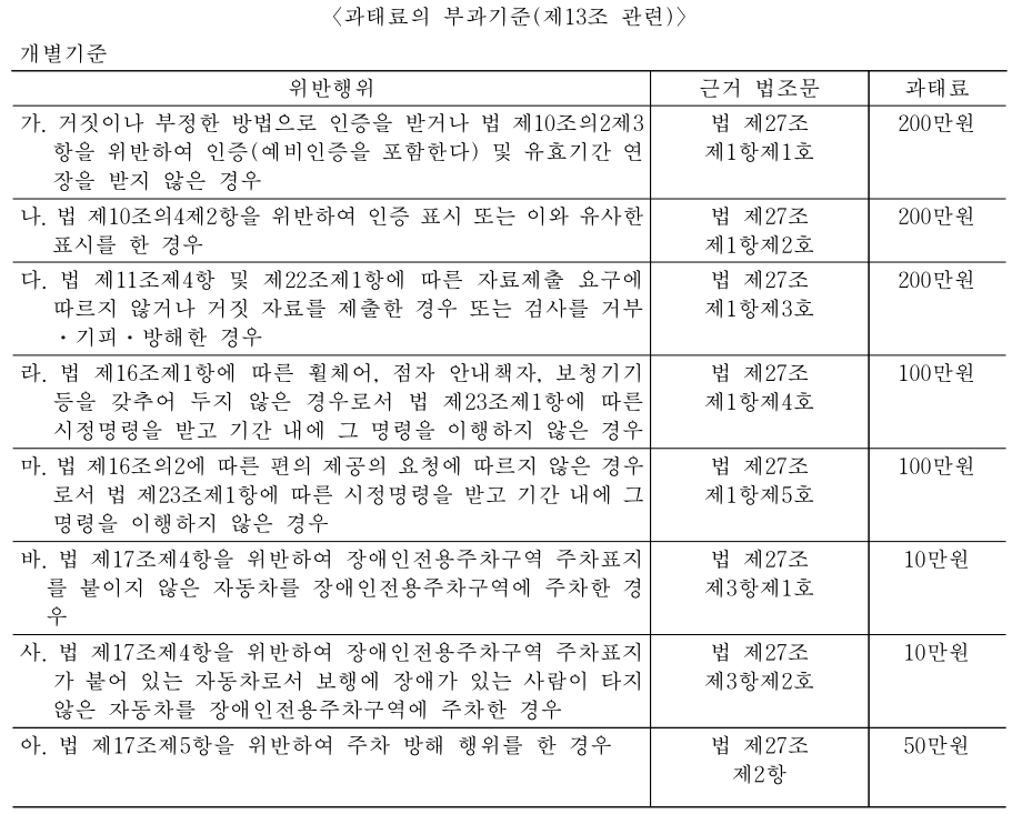이번 개정안은 지난 6월 8일 개정된 ‘장애인등편의법’ 시행에 맞춰 법률에서 위임한 장애물 없는 생활환경(BF) 인증 의무 시설의 범위와 인증의무 위반 시 과태료의 세부기준을 정했다. 이번에 개정된 시행령은 12월 4일부터 시행된다.