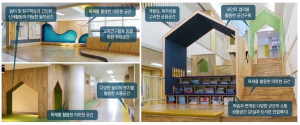 세종 솔빛숲유치원의 경우 주변 야산과 조화로운 공간 구성을 위해 목재 데크 등 친환경적 마감재를 다수 활용해 아이들이 자연 속으로 들어갈 수 있는 훌륭한 매개 공간으로 탄생했다.