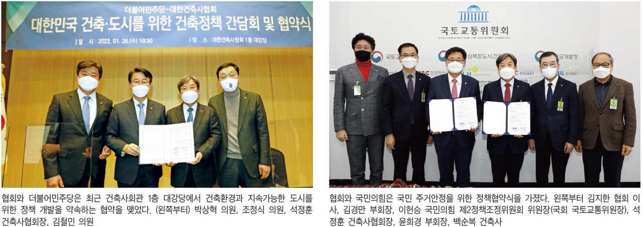대한건축사협회가 최근 더불어민주당, 국민의 힘 선거대책위원회 관계자들과 차례로 만나 국민 주거 안정과 지속가능하고 안전한 도시 구축을 위한 정책과제 발굴, 추진을 위한 정책협약식을 가졌다.