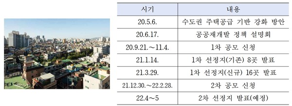 공공재개발 사업은 2020년 5월 6일 국토교통부가 내놓은 ‘수도권 주택공급 기반 강화방안’에서 처음 방향성이 잡혔다.