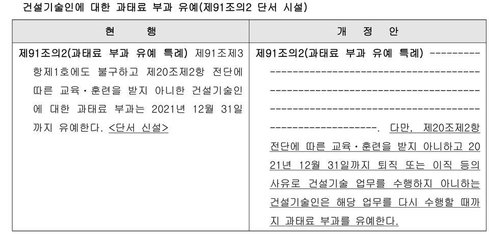 이에 개정안은 이직·퇴직 등으로 현재 건설업에 종사하지 않는 자가 다시 건설기술업무를 수행할 때까지 과태료 부과 유예를 연장해 제도 실효성을 확보토록 했다.