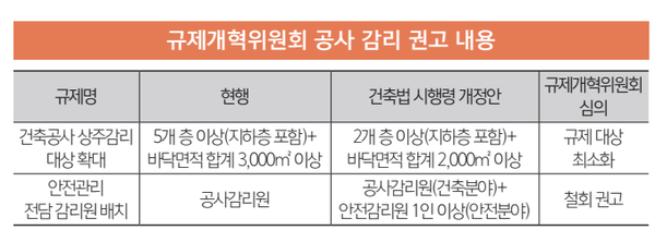 규제개혁위원회는 상주감리 대상 건축공사 확대 건과 관련해서도 규제의 축소를 권고했다. 안전사고 감소와 부실공사로 인한 인적·물적 피해 예방 등 규제가 목표로 하는 ‘국민안전 강화’의 중요성은 인정하면서도 건축물 용도, 건축물 층수·면적에 따른 안전사고 위험성 등을 면밀히 재검토해 규제 대상을 필요 최소한도로 수정할 것을 개선 권고한 것이다.