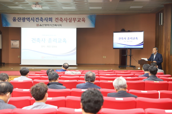 울산광역시건축사회는 지난 10월 12일 울산건축사회관 5층 강당에서 ‘2022년도 건축사실무교육’을 실시했다. 이날 교육은 건축사 100여명을 대상으로 전문교육인 시도별 건축정책 및 제도(전영철 건축사)와 건축사의 사회적 책무에 대한 윤리교육(김원효 회장) 총 2강좌로 구성됐다. 한편, 울산광역시건축사회는 예정된 내년도 건축사실무교육을 내실 있게 진행하기 위해, 회원들의 의견을 수렴하여 직무와 관련된 다양한 교육을 확대해나갈 계획이다.