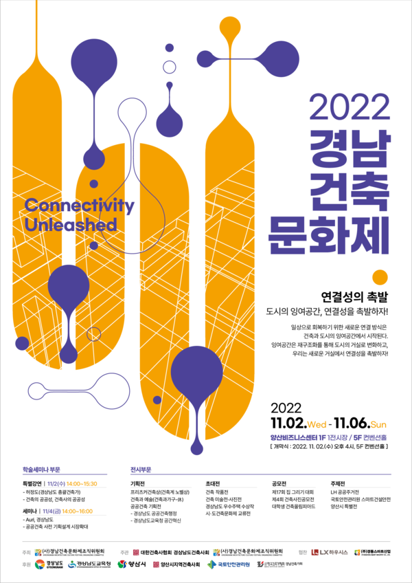 경남건축문화제가 11월 2일 개막식을 시작으로 6일까지 양산 비즈니스센터 전시실·컨벤션홀에서 개최된다. 올해로 12회째를 맞이하는 행사는 프리츠커 건축상 수상작 전시, 공공혁신 기획전, 스마트건설안전 체험, 준공건축물 작품전 등 6개 부문 17개 주제의 다양한 전시가 이뤄진다. 오공환 (사)경남건축문화제조직위원장은 “2022 경남건축문화제가 건축 관련 전문가뿐만 아니라 일반인과 학생들이 참여해 우리 시대의 건축을 접하고 이해하는 건축문화의 장이 되길 바란다”고 전했다.