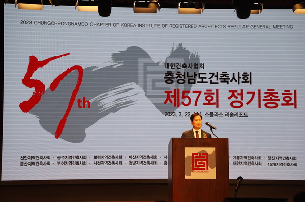 충청남도건축사회는 3월 22일 충남 예산 스플라스 리솜 대연회장(GRAND HALL)에서 본협회 석정훈 회장, 건축사공제조합 신우식 이사장, 홍문표 국회의원, 도의회 김기서 건설소방위원장, 충남건축사회 회원 400여명이 참석한 가운데 제57회 정기총회를 성황리에 개최했다.