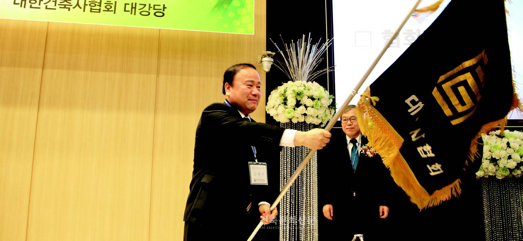 이날 강성익 회장으로부터 협회기를 전달받은 김영수 신임회장은 지난 3월 6일부터 본격적인 업무를 시작했으며, 앞으로 2년간 전국 8천 8백여의 건축사 회원을 대표해 협회를 이끌게 된다.