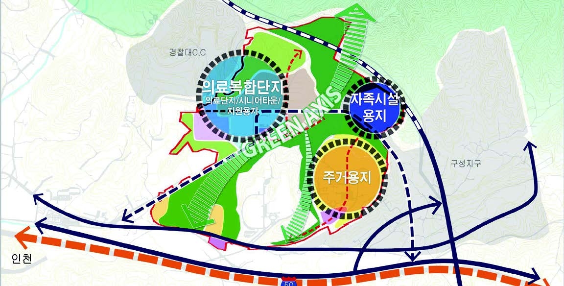 먼저, 계획부지 중앙에 법화산으로 이어지는 녹지축을 연결․보전해 지역주민들이 자연공원과 등산로 등으로 활용할 수 있도록 하고, 중앙녹지축 좌측의 경찰대 부지에는 고령화 시대의 수요에 기반해 상대적으로 부족한 용인시의 복지 서비스 환경을 개선하고자 의료복합타운 및 시니어타운을 계획했다.