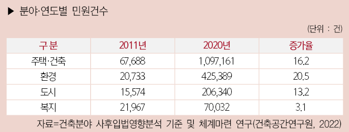 건축인허가의 신뢰성 저하와 민원 증가는 주택·건축 분야에서도 두드러지게 나타난다. 2011년에 67,688건이었던 민원은 2020년에는 1,097,161건으로 급증했다. 〔건축분야 사후입법영향분석 기준 및 체계마련 연구(건축공간연구원, 2022년)〕 건축 분야의 민원이 약 16배 증가한 것은 이 문제의 심각성을 뒷받침한다.