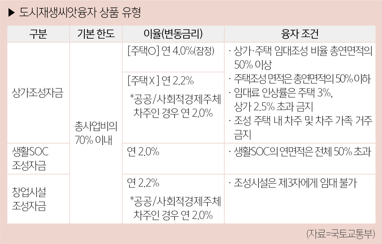 융자 상품은 상가조성자금, 생활SOC조성자금, 창업시설조성자금으로 구분되며, 차주 유형에 따라 연 2.0%에서 2.2%의 금리가 적용된다. 주택을 조성하는 경우 모든 차주에게 연 4.0% 금리가 적용된다.