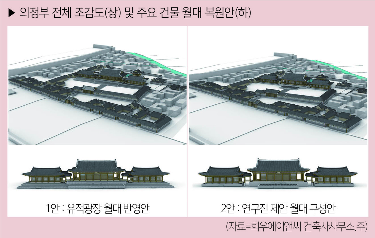 이에 따라 의정부 전체 복원안에서는 주요 건물의 월대(月臺; 조선시대 의식 등 행사를 위해 주요 건물 앞에 두는 넓은 기단) 형태에 대한 해석과 관련해, 현재 개장된 역사유적광장 정비안 외에도 연구진이 월대의 성격을 규정하고 유사 사례(종친부)를 참고해 고증한 제2안도 함께 제시됐다. 이번 프로젝트를 통해 제작된 디지털 자료는 향후 조성될 의정부 역사유적광장 디지털 안내센터에서 전시될 예정이다. 관람객들은 이를 통해 역사적 공간을 더욱 생생하고 새로운 방식으로 체험할 수 있다.