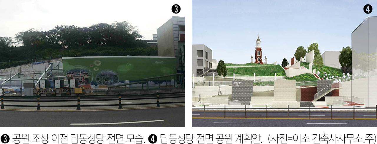 답동성당 관련 프로젝트는 성당 전면의 경사지에 공원을 조성하는 작업이었습니다. 이는 국가유산인 성당뿐만 아니라, 그 일대의 도시적 경관까지도 역사적·문화적 관점에서 접근해야 한다는 점을 잘 보여주는 사례였습니다. 해안가 언덕 위에 세워졌던 답동성당 주변의 매립 과정과 도시화 과정을 고증함으로써, 경관 회복의 방향을 설정할 수 있었습니다.