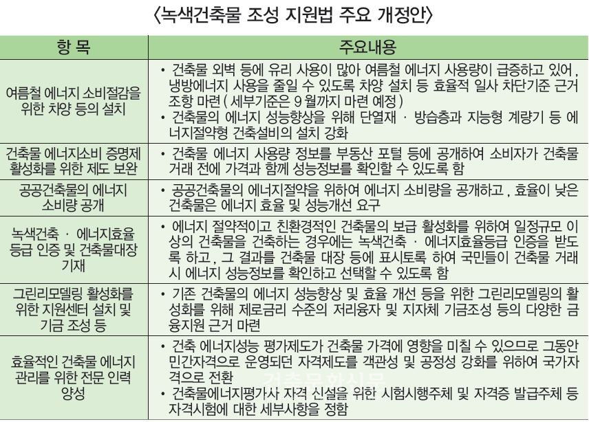 개정된 주요 내용은 먼저 최근 유리를 활용한 커튼월 건축물이 많아짐에 따라 에어컨 사용 등 에너지 사용량이 급증, 이를 줄이기 위한 효율적 일사 차단기준 근거조항이 마련된다. 이에 따라 앞으로 외벽이 유리로 지어진 건축물에는 차향 시설을 의무적으로 설치해야 한다. 국토부는 관련 세부기준은 9월까지 마련한다는 방침이다. 이와함께 건축물의 에너지 성능향상을 위해 단열재․방습층과 지능형 계량기(BEMS) 등 에너지절약형 건축설비의 설치가 강화된다. ‘BEMS(Building Energy Management System)’란 건물에너지 절감을 위해 에너지원별 센서·계측장비, 분석 S/W 등을 유·무선 통신망으로 연계하여 실시간 에너지 상황을 모니터링하고 제어하는 통합 관리 시스템이다.