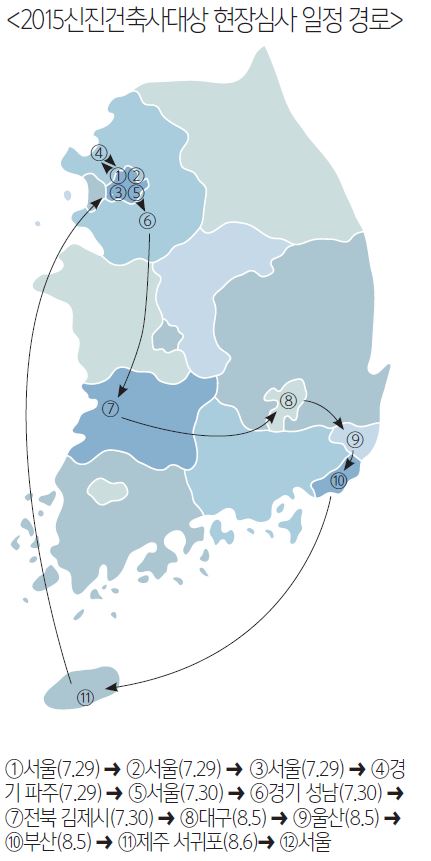 국토교통부와 대한건축사협회가 공동주최하는 ‘2015 대한민국 신진건축사 대상’ 현장심사가 7월 29일~30일, 8월 5일~6일까지 총 4일간 진행됐다.