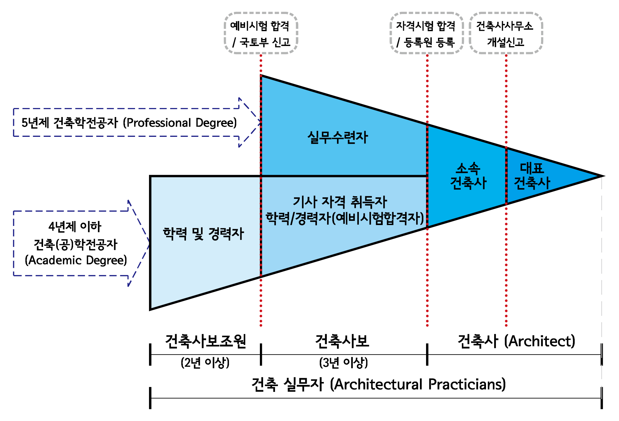 국내 건축사사무소 인적구성 및 건축사 자격 취득 과정을 보면, 현재 건축사가 되기 위해서는 정규적인 건축교육 프로그램을 이수한 후 일정기간의 수련기간을 통해 실무적 지식과 경험을 습득해야 하고, 또한 그 사실을 입증할 수 있어야 하는 것이 현실이다. 2011년 5월 30일 건축사법 개정에 의해 건축실무관련 UIA 권고안에 부합되는 건축학교육 프로그램(5년제)과 이에 따른 실무기준이 마련됐다. 기본적으로 건축사사무소에서 3년 이상 실무수련을 받아야 하고 실무수련을 받기 위해서는 일정 기준의 건축학교육 프로그램을 이수해야 하는 것이 개정안의 주요 골자이고 개정에 대한 경과조치가 별도로 마련됐다.